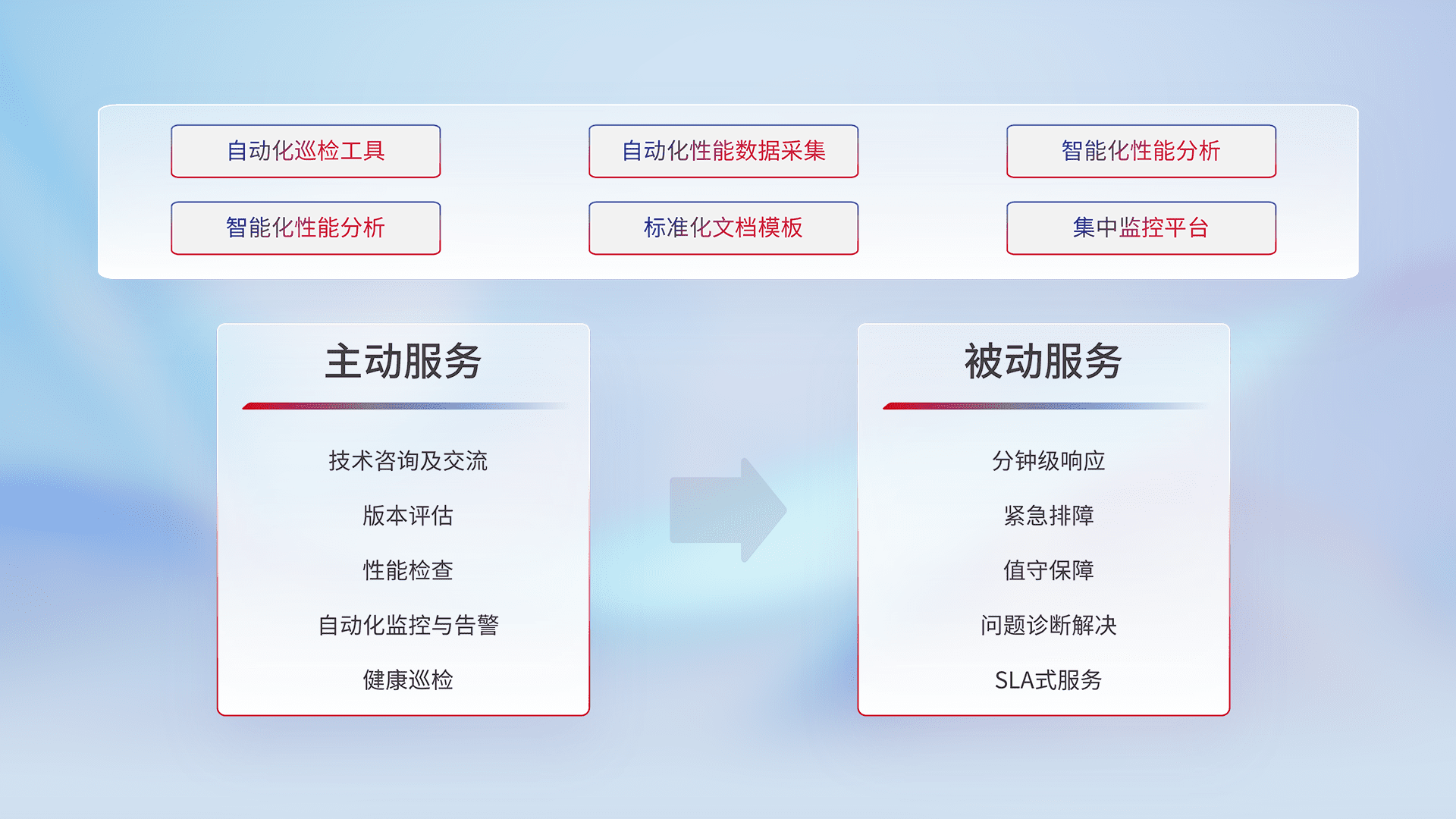 智能化工具和标准化文档,,保障服务质量,,,提供主动服务(包含技术咨询、、、版本评估、、性能检查、、、、自动化监控与告警、、健康巡检)和被动服务包含(分钟级响应、、、紧急排障、、值守保障、、问题诊断解决、、、SLA服务)。。。。